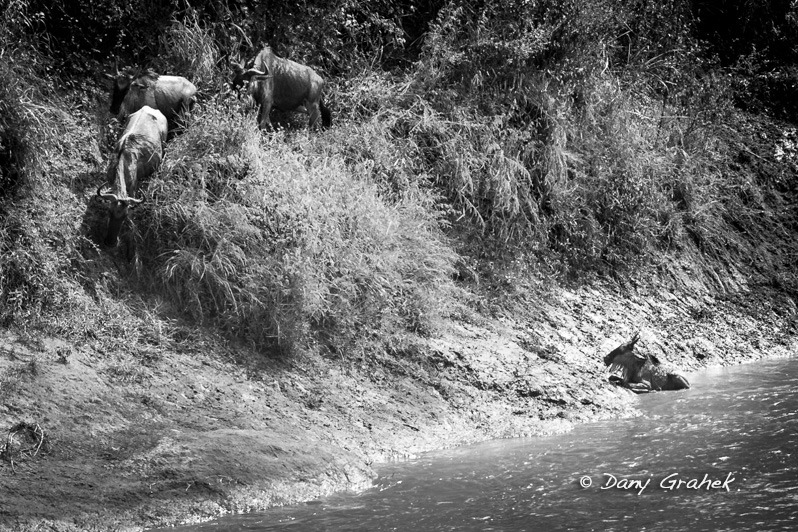 Il y a les léopards tapis dans les bosquets qui s'agrippent aux pentes, les lionnes qui observent non loin de là, d'un air placide les mouvements de foule des animaux, cherchant une occasion propice, pour porter leur attaque, les crocodiles guettant dans l'eau boueuse de la rivière, un repas facile et puis ils y a ceux, qui lors de la traversée vont se blesser, celant ainsi leur sort.