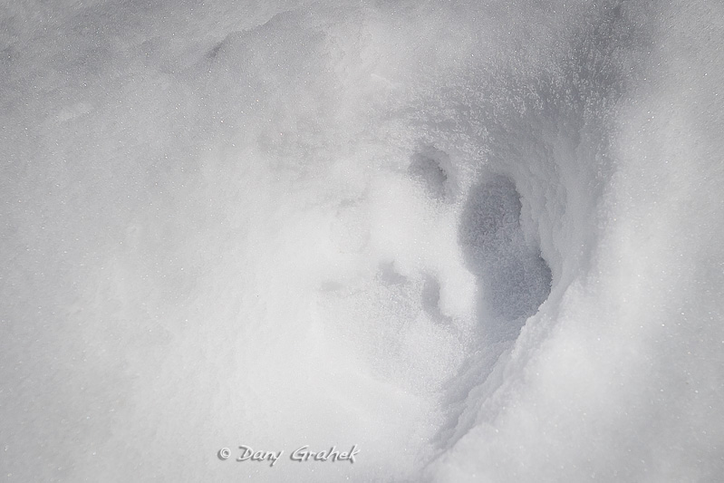 Elle est pourtant là, je le sais. Quelques empreintes trahissent sa présence. Sur un névé, sa longue queue trainante sur le sol dessine un sillon entre ses pas. Mais je n'ai pas encore croisé son regard aux grands yeux clairs.